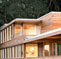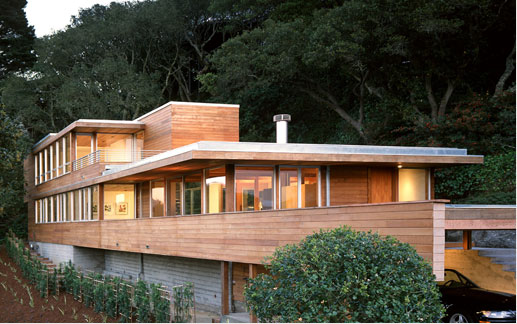 A composition of long horizontal lines is used to nestle the house into its hillside site. Post and beam construction reveals the structure of the building while an open plan, floor to ceiling doorways and wood ceilings emphasize the continuity of space and indoor-outdoor connections.